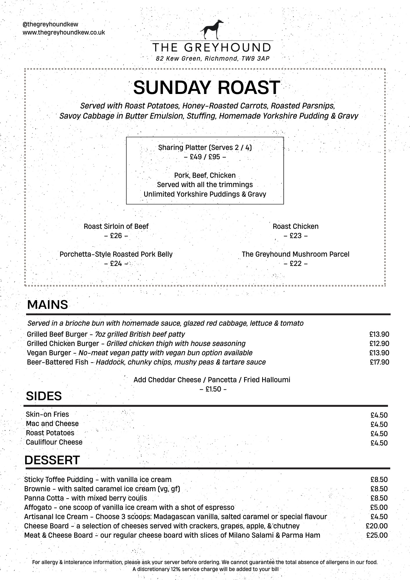 At The Greyhound, our famous family-style Sunday Roast has become a cherished tradition for locals — but we’re so much more than a Sunday destination. Whether you’re celebrating with family, catching up with friends, or bringing along your four-legged companion, our doors are always open. Proudly family-run and part of the heart of the Kew community, we’re just minutes from Kew Bridge and the Elizabeth Gate of Kew Gardens, with Kew Pier only steps away for those arriving by boat.
